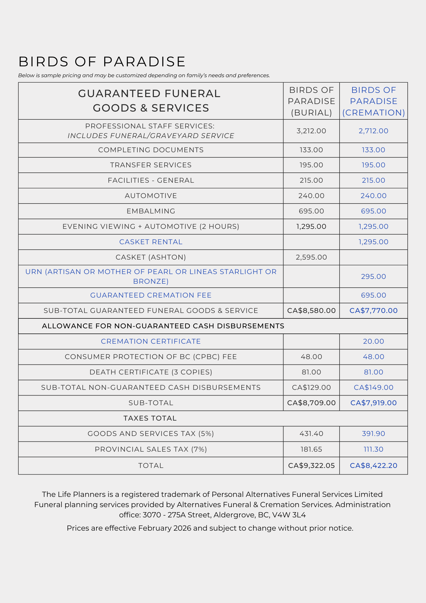The Birds of Paradise symbolizes paradise and freedom. The flower it was named after represents joy and freedom. It’s the ultimate dream… to be free and happy in paradise. The Birds of Paradise package is aptly named for the plan that suits the event closest to the tradition. It includes one night for your family and friends to gather and honor your memory. Your family and friends will have a 2nd chance to see you the next day, for the last time, in a formal service. Depending on your preference, it will include the service where you are laid to rest OR the cremation. It will also include special effects of your choice, to make the event personal to your style.