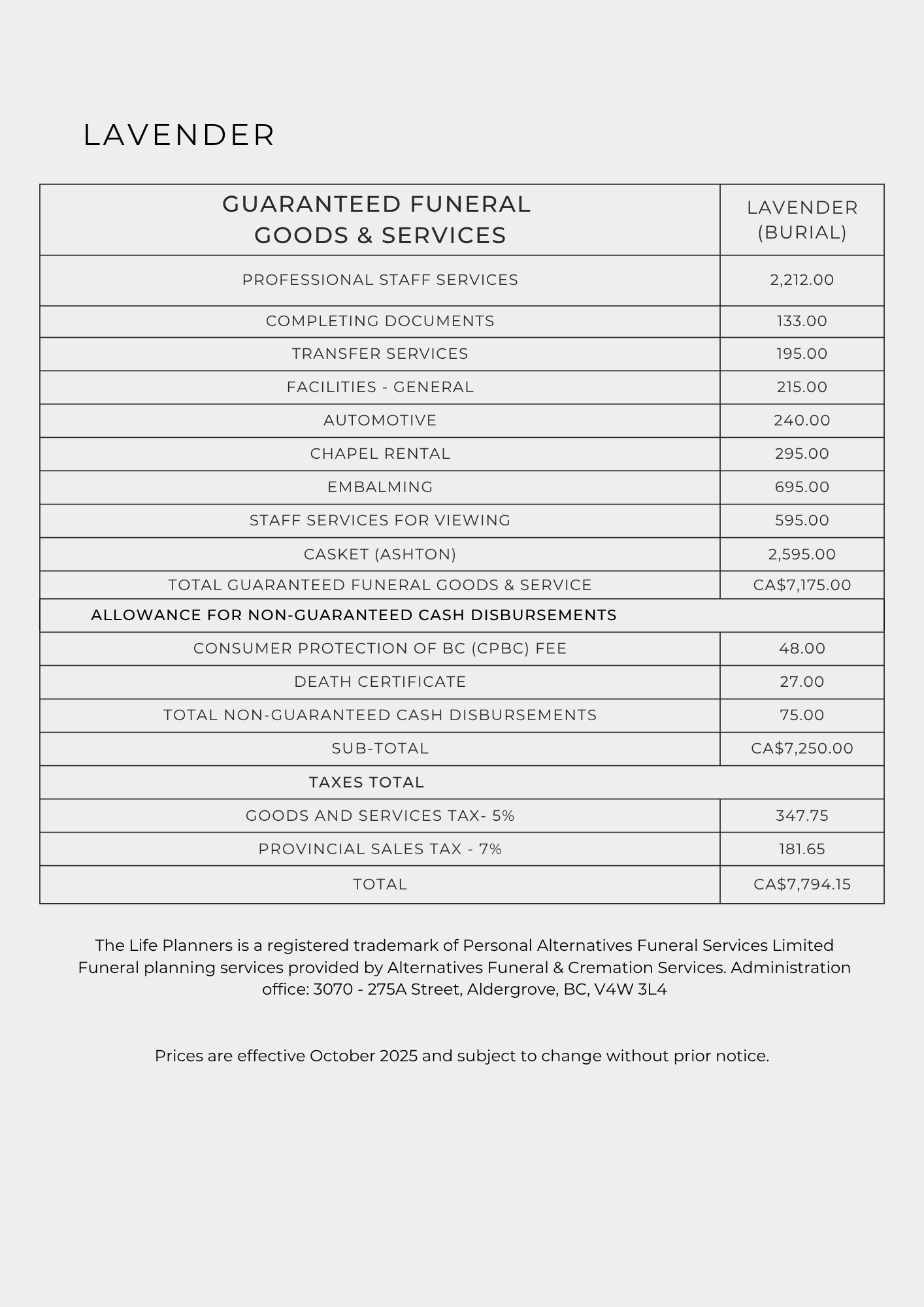 The Lavender flower is a symbol of serenity, calm, grace, devotion, silence, and purity. It is the perfect representation of a simple and solemn memorial that will give your loved ones just enough time to honour your memory and say their farewells as you are laid to rest. The Lavender Package includes a 4-hour full-body viewing at the Alternatives Chapel before burial.